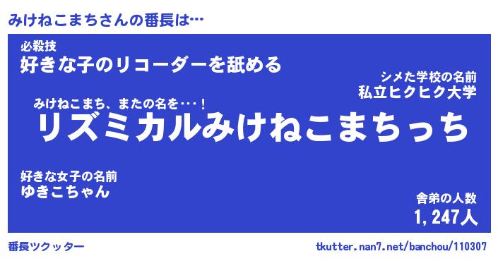 | ヘコむあだ名 | 『みけにー』『豆乳』『みけっちょ』 |