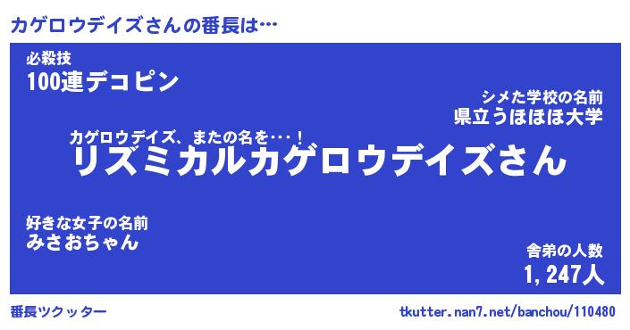 | ピコ太郎風あだ名 | 『カコ四郎』『ピカ六郎』『カゲ六郎』 |