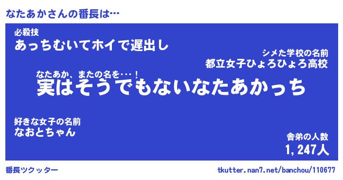 | 意味不明あだ名 | 『ペロリンなたあか』『永久保存なたあか』 |