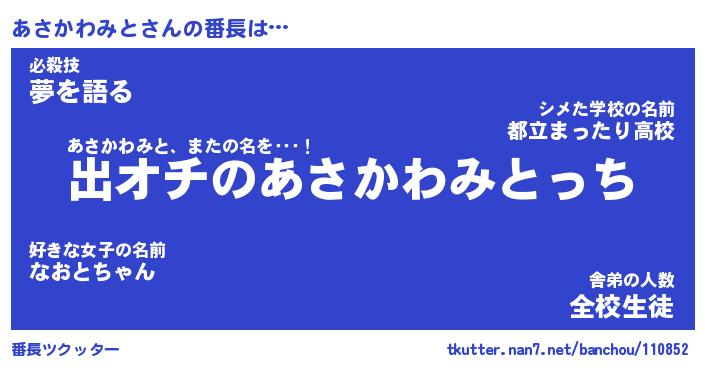 | ヘコむあだ名 | 『あさもー』『つくし』『あさ太郎』 |