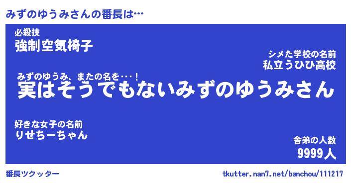 | 肩書あだ名 | 『みずのゆうみ店長』『みずのゆうみ班長』 |
