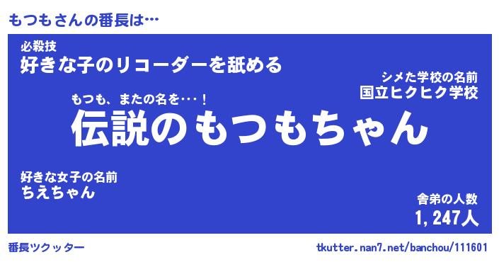 | ヒーロー風カッコイイあだ名 | 『スーパーモツモ』『ウルトラもつもマン』 |
