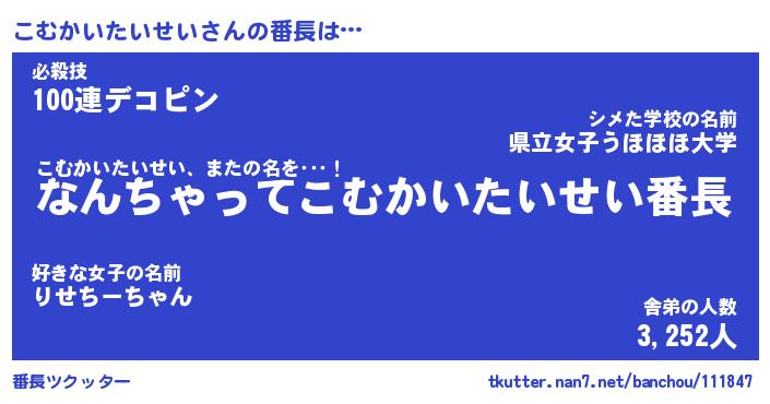 | 男性向けラノベタイトル風あだ名 | 『こむかいたいせいの憂鬱』 |
