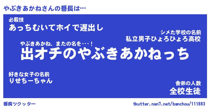 | ヒーロー風カッコイイあだ名 | 『スーパーヤブキアカネ』『暗黒騎士ヤブ』 |