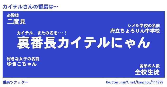 | 意味不明あだ名 | 『ペロリンカイテル』『永久保存カイテル』 |