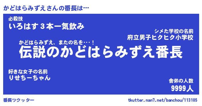 | 男性向けラノベタイトル風あだ名 | 『かどはらみずえの憂鬱』 |