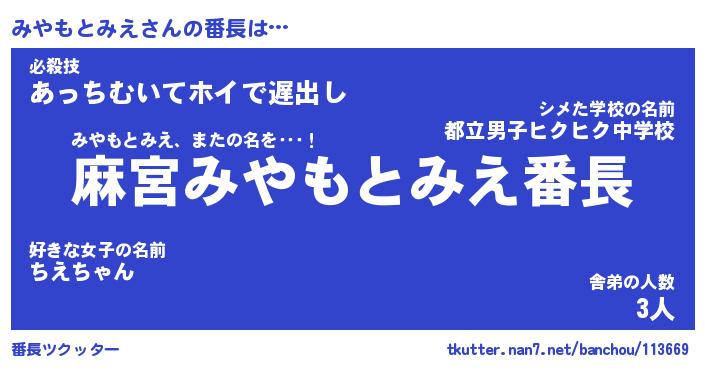 | ヒーロー風カッコイイあだ名 | 『スーパーミヤモトミエ』『魔戒騎士ミヤ』 |
