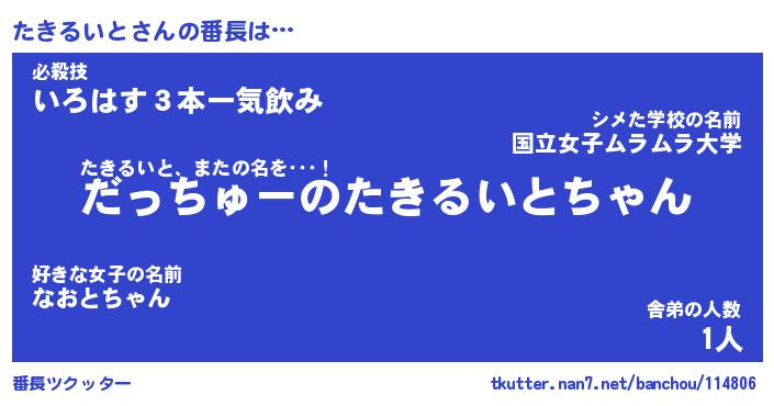 | 肩書あだ名 | 『たきるいと店長』『たきるいと大統領』 |