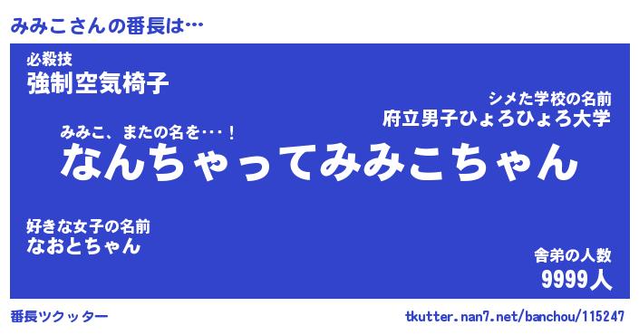 | 伝説のあだ名 | 『伝説のスナイパーみみこ』 |