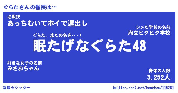 | 意味不明あだ名 | 『ペロリンぐらた』『ぐらたフォーエバー』 |