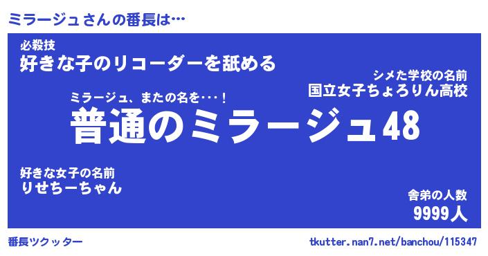 | 肩書あだ名 | 『ミラージュ店長』『ミラージュ大統領』 |