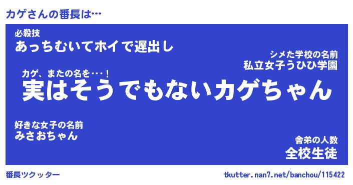 | 肩書あだ名 | 『カゲ店長』『カゲ総理大臣』 |
