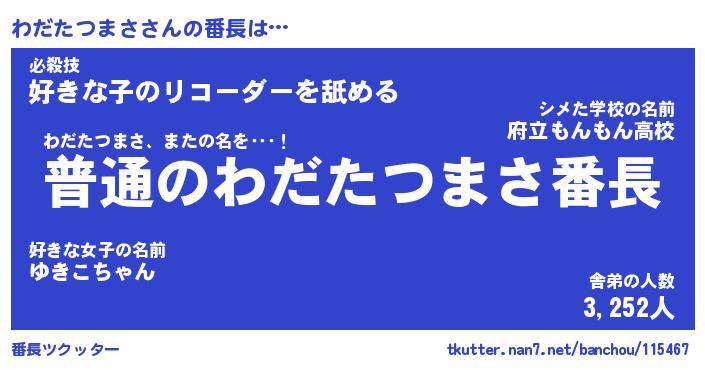 | 肩書あだ名 | 『わだたつまさ社長』『わだたつまさ班長』 |