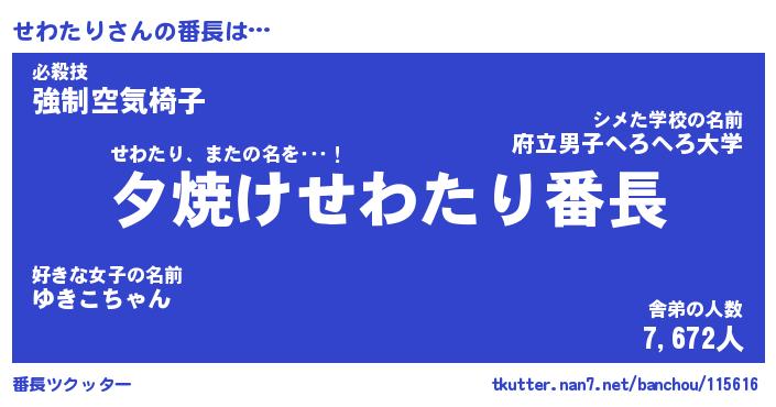 | ヒーロー風カッコイイあだ名 | 『スーパーセワタリ』『炎刃騎士セワ』 |