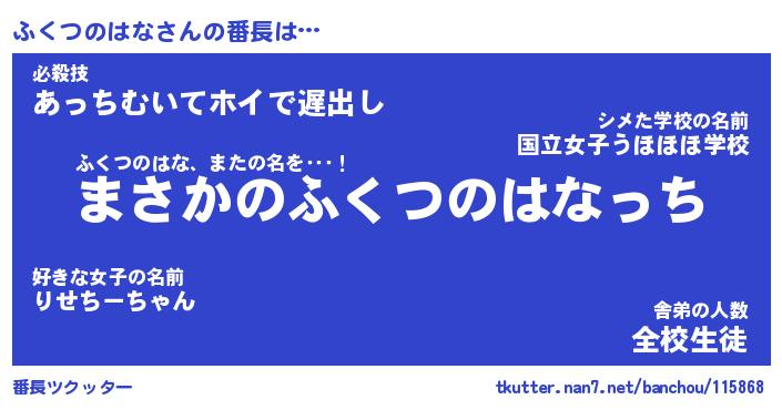 | ヒーロー風カッコイイあだ名 | 『スーパーフクツノハナ』『暗黒騎士フク』 |