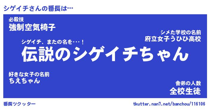 | 意味不明あだ名 | 『ペロリンシゲイチ』『永久保存シゲイチ』 |
