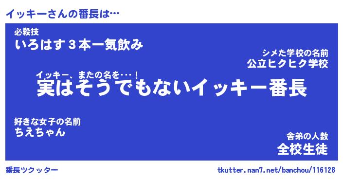 | ヒーロー風カッコイイあだ名 | 『スーパーイッキー』『銀牙騎士イッ』 |