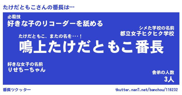 | ヘコむあだ名 | 『たけにゅー』『酢こんぶ』 |