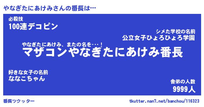 | 伝説のあだ名 | 『封印されしスナイパーやなぎたにあけみ』 |