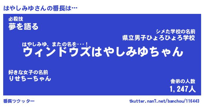 | ファンタジー風あだ名 | 『ハヤフェル』『エターナルハヤシミユー』 |