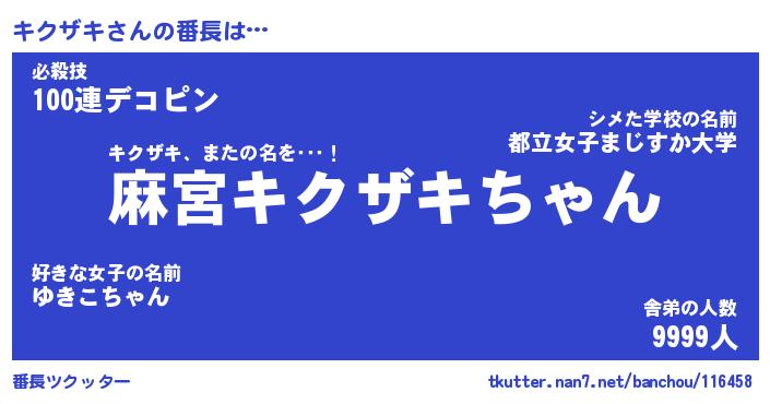 | 意味不明あだ名 | 『ペロリンキクザキ』『永久保存キクザキ』 |