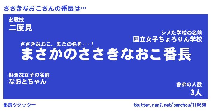 | ヒーロー風カッコイイあだ名 | 『スーパーササキナオコ』『魔戒騎士ササ』 |