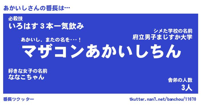 | 意味不明あだ名 | 『ペロリンあかいし』『永久保存あかいし』 |