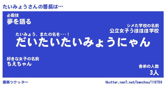 | 肩書あだ名 | 『たいみょう社長』『たいみょう総理大臣』 |