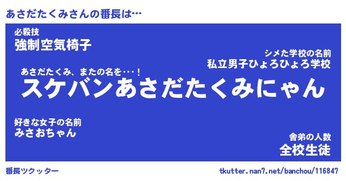 | 肩書あだ名 | 『あさだたくみ社長』『あさだたくみ先生』 |