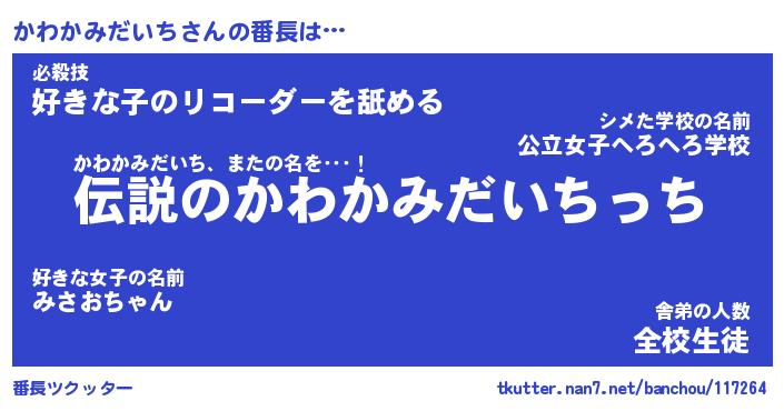 | 伝説のあだ名 | 『伝説のスナイパーかわかみだいち』 |