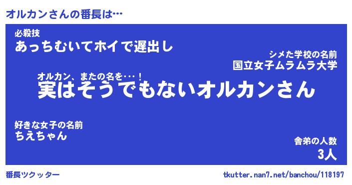 | 意味不明あだ名 | 『ペロリンオルカン』『永久保存オルカン』 |