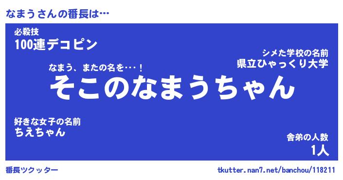 | ヒーロー風カッコイイあだ名 | 『スーパーナマウ』『ウルトラなまうマン』 |