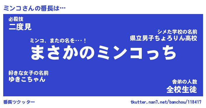 | ヒーロー風カッコイイあだ名 | 『スーパーミンコ』『ウルトラミンコマン』 |