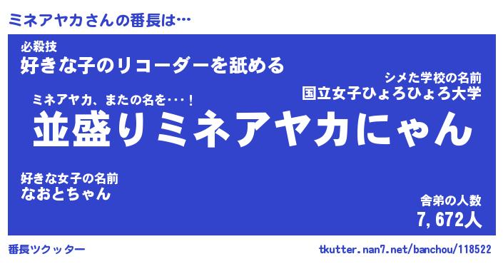 | 肩書あだ名 | 『ミネアヤカ社長』『ミネアヤカ国家主席』 |