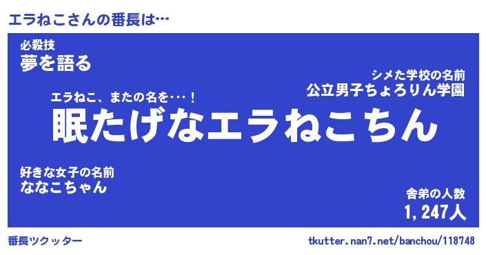 | 意味不明あだ名 | 『ペロリンエラねこ』『永久保存エラねこ』 |
