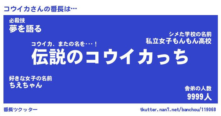| ファンタジー風あだ名 | 『コウフェル』『エターナルコウイカー』 |