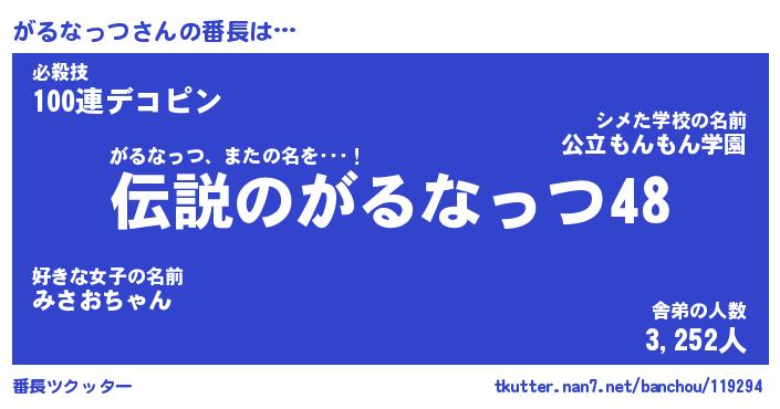 | 肩書あだ名 | 『がるなっつ店長』『がるなっつ総理大臣』 |