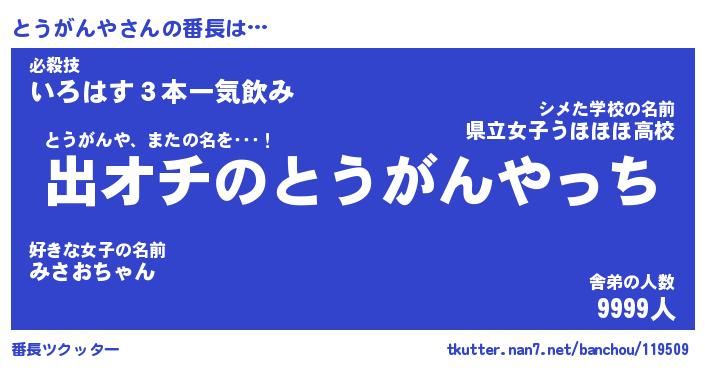 | 伝説のあだ名 | 『伝説のスナイパーとうがんや』 |