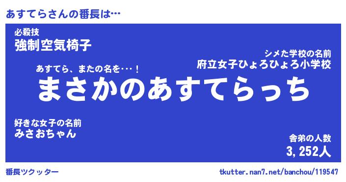 | 欧米人風あだ名 | 『マイケルあすてら』『ウサインあすてら』 |
