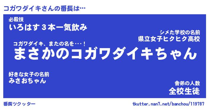 | 肩書あだ名 | 『コガワダイキ社長』『コガワダイキ担任』 |