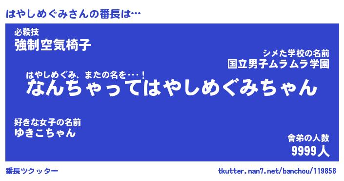 | ヒーロー風カッコイイあだ名 | 『スーパーハヤシメグミ』『天弓騎士ハヤ』 |