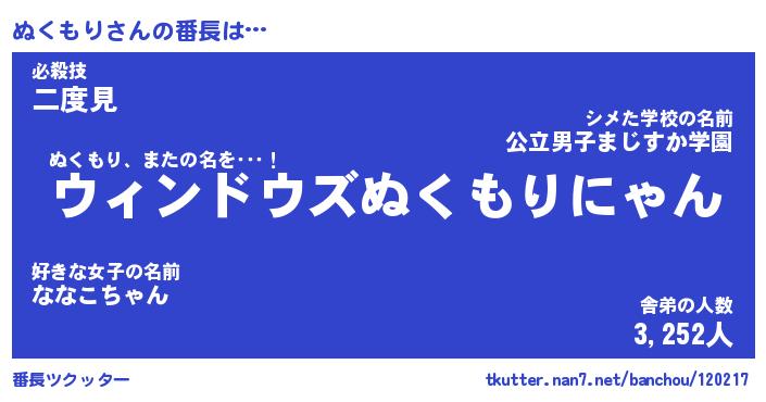 | ポケモン風あだ名 | 『ヌクチュウ』『ヌクモダネ』 |
