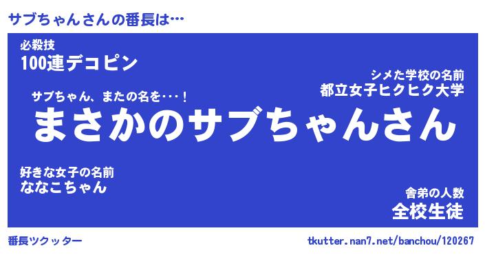 | ヒーロー風カッコイイあだ名 | 『スーパーサブチャン』『銀牙騎士サブ』 |