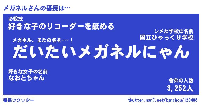 | 意味不明あだ名 | 『ペロリンメガネル』『永久保存メガネル』 |