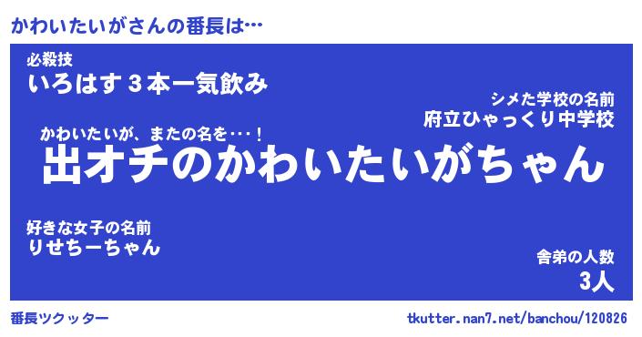 | ヒーロー風カッコイイあだ名 | 『スーパーカワイタイガ』『魔戒騎士カワ』 |