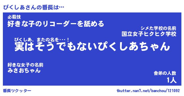 | 意味不明あだ名 | 『ペロリンぴくしあ』『永久保存ぴくしあ』 |