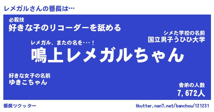 | 意味不明あだ名 | 『ペロリンレメガル』『永久保存レメガル』 |
