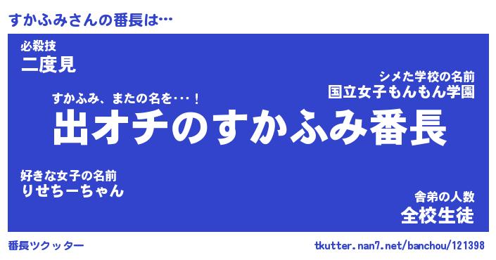 | 肩書あだ名 | 『すかふみ店長』『すかふみ総理大臣』 |