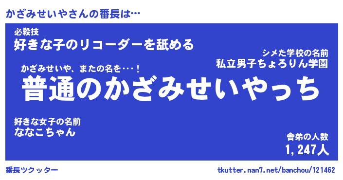| 肩書あだ名 | 『かざみせいや御曹司』 |