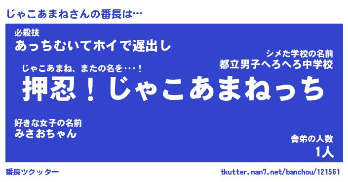 | 伝説のあだ名 | 『封印されしスナイパーじゃこあまね』 |